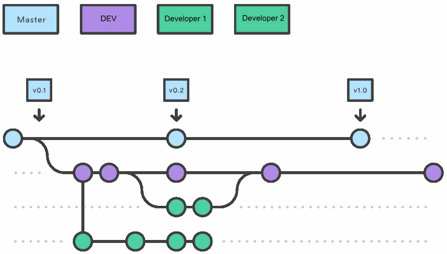 master: The latest approved version of the code. Only project admins are allowed to merge code into this branch;DEV: The development branch where changes from the different contributors are combined and tested before being merged with themasterbranch. Kind of like a beta but not actually released to the users of the software. Merges on this branch are also restricted to project admins;Developer 1: A named branch for the first developer where they can commit their changes. This is where all the hard work is done. Only the developer him/herself can write into this branch so that they can be sure that any changes where brought about by their own actions. Note that even project admins should be working in their own branch when they are making changes to the code.Developer 2: The same as above for the second developer...