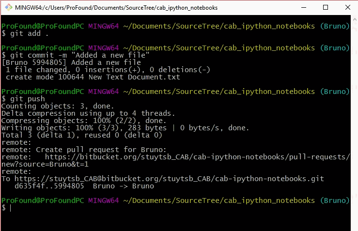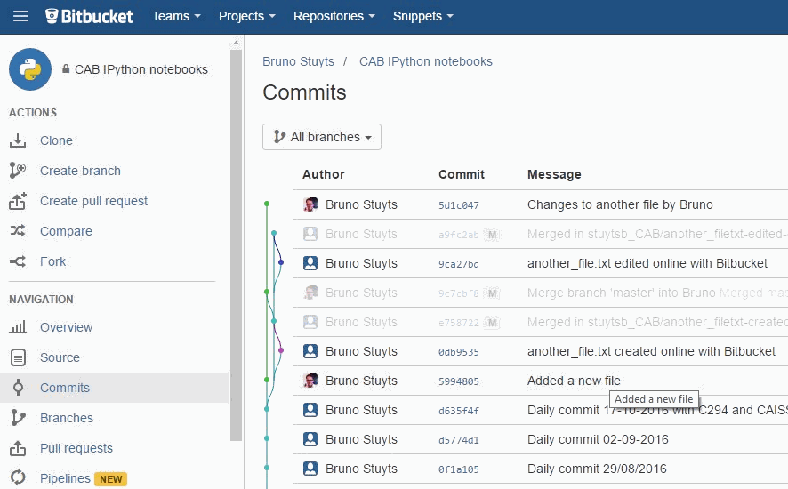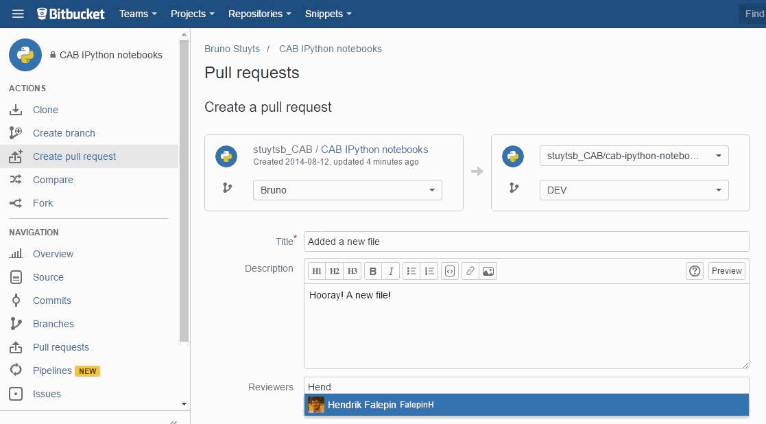 The pull request itself needs to be made through the Bitbucket web interface. With your remote development branch now containing your latest set of changes, you can go ahead and create the pull request from your branch to the DEV branch. You can explicitly ask members of the project team to review your code and annotate the pull request with a description of what you did. Note that it is also good practice to give self-explanatory titles to individual commits.